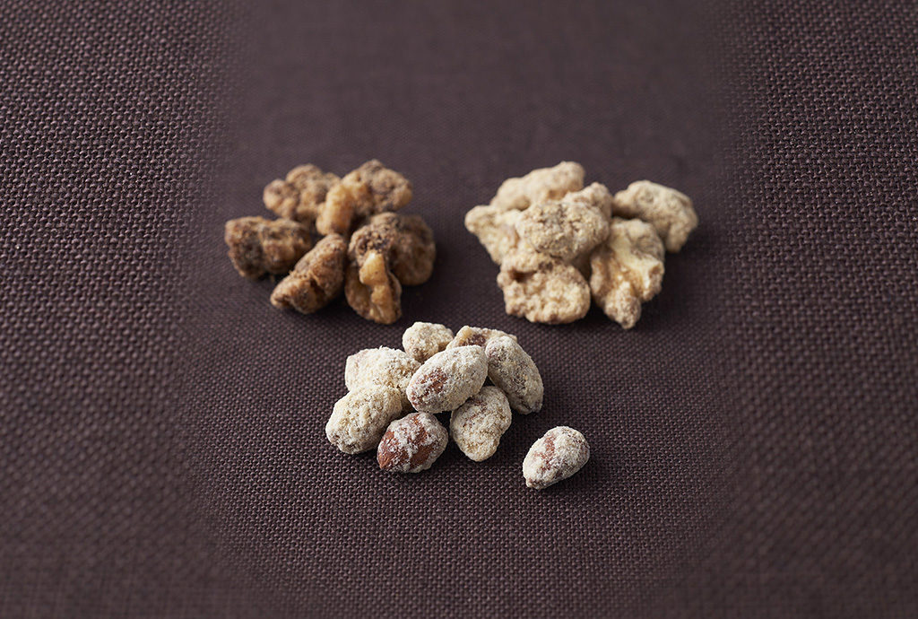 白クルミはきなこ飴、黒クルミは黒糖飴、