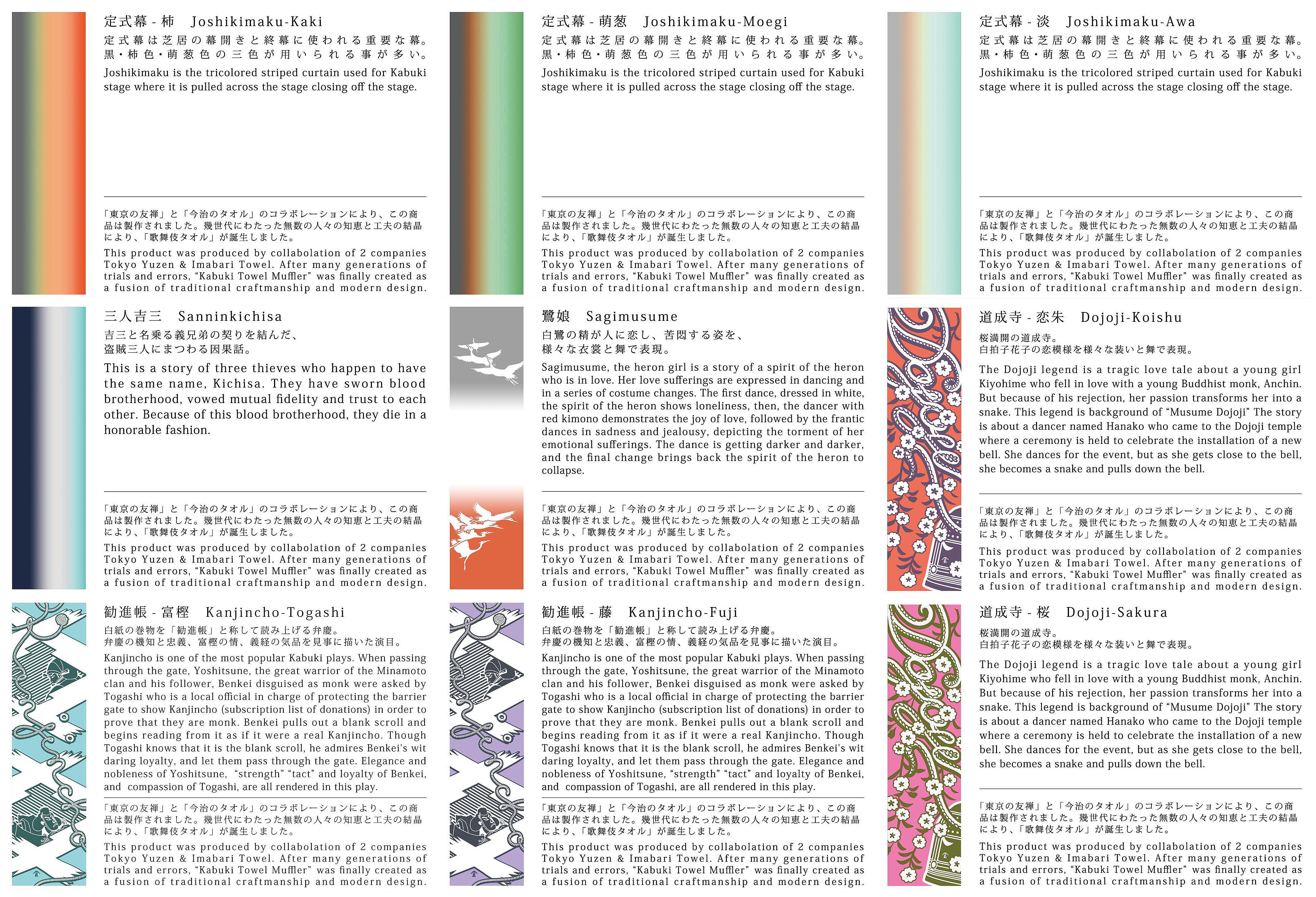 歌舞伎タオル シルクメッシュ染めタイプ 2017年すみだモダン認証商品 墨田区で古くから歌舞伎衣裳の製作を手がける石山染交が、 デザイナーとともに開発したタオル地のマフラー。 勧進帳、道成寺 4種類 130cm ご紹介の商品について価格が変更のものもあり、詳しくはまち処へお尋ねください 3,850円(税込) (株)石山染交 江戸切子 クリスタルオールド「漣 金赤」北斎漫画吹き出し帳(メッセージ) 前のページに戻る
