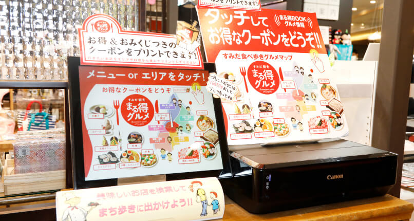 観光案内カウンターとすみだのまち歩きコーナーには、グルメガイドとお店検索が画面で見られるタッチパネルがあります。お目当てのお店の情報を、クーポン付き(一部無し)でプリントアウトできます。おみくじも付きます!