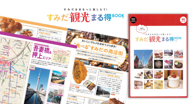 墨田区の詳しい観光情報とガイドマップ、お店情報などを満載した「すみだ観光まる得BOOK」(墨田区観光協会発行 無料)を用意しています。すみだをトコトン楽しむためにぜひ1冊どうぞ。